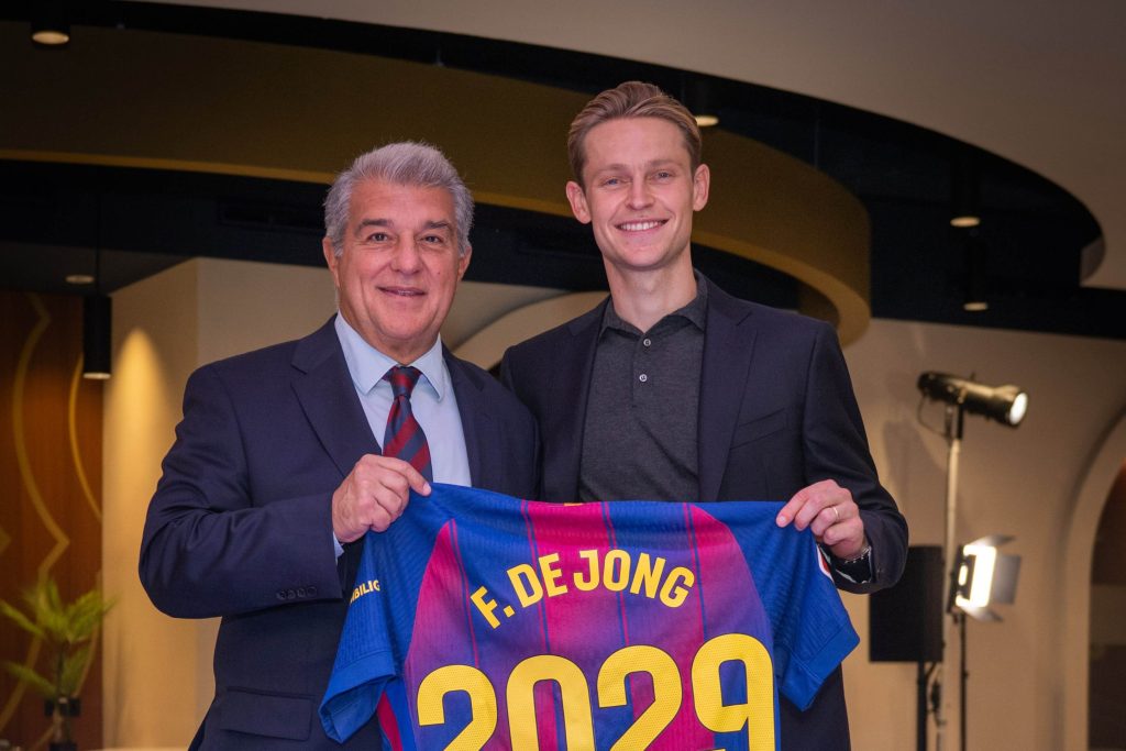 FC Barcelona has officially announced that midfielder Frenkie de Jong has signed a new contract with the club. This deal allows him to stay at Barcelona until 2029. The announcement was made during a ceremony held at the club’s headquarters, attended by President Joan Laporta, Vice President Rafael Yuste, and Sporting Director Deco.