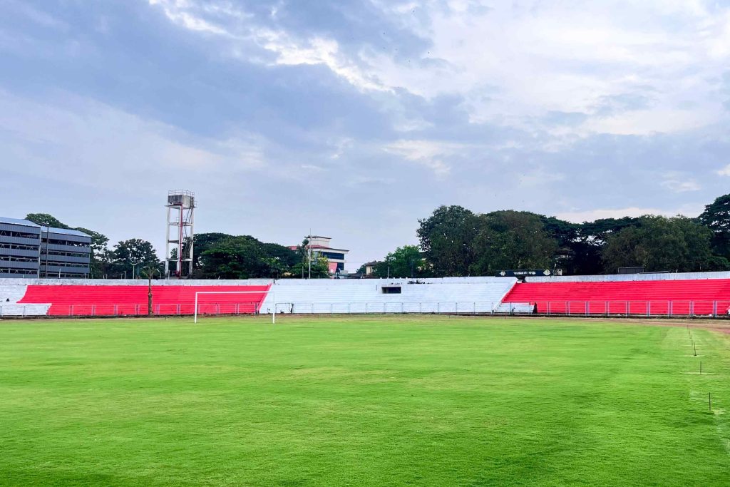 Kannur: The painting work at Kannur Municipal Jawahar Stadium, the home ground of the Kannur Warriors Football Club in the Super League, is nearing completion. The south gallery has been painted in red and white, reflecting the colors of the home and away jerseys of the Kannur Warriors FC.